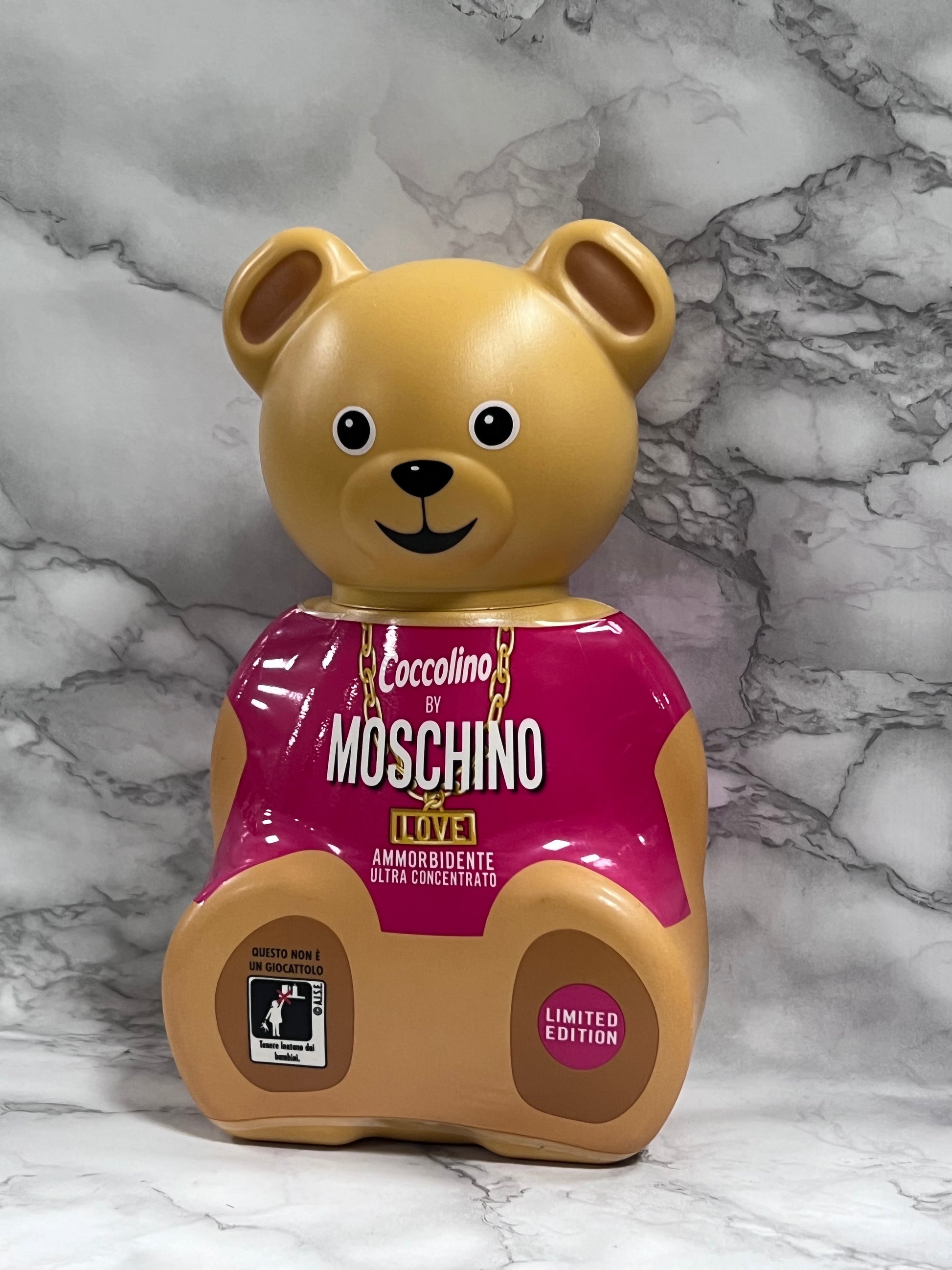 Ammorbidente Coccolino x Moschino ultra concentrato al profumo di rose, con note di lampone e muschio. 38 lavaggi, 570ml.