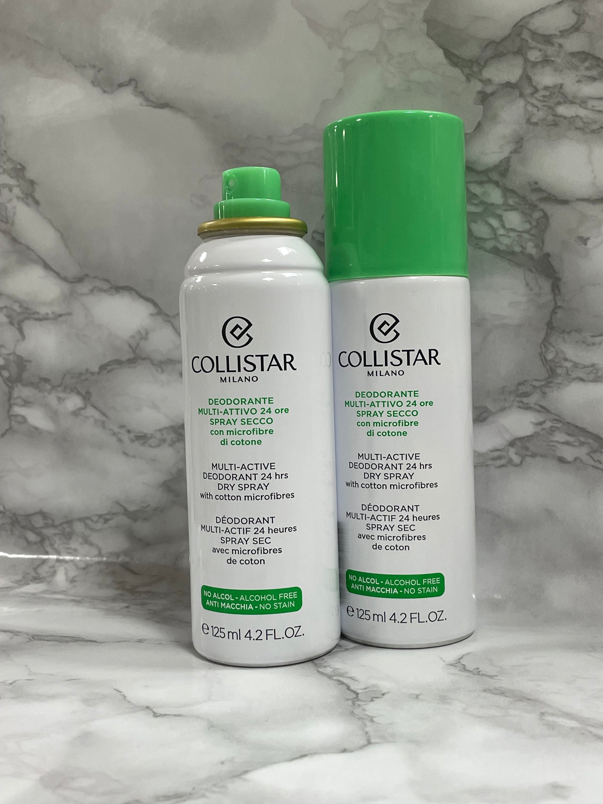 Deodorante multi-attivo 24 ore. Spray secco, con microfibre di cotone. Anti-macchia. No alcol. 125 ml.