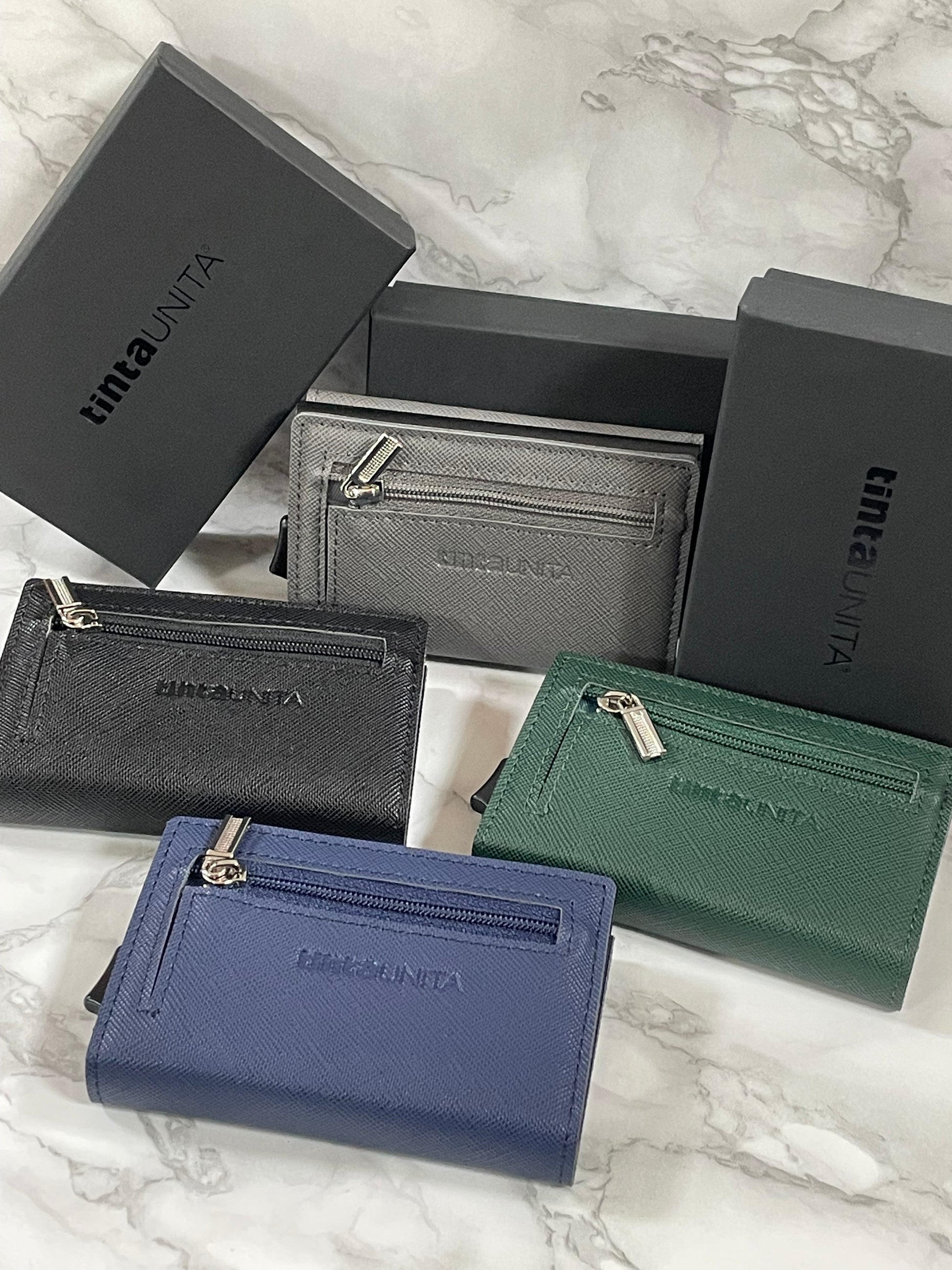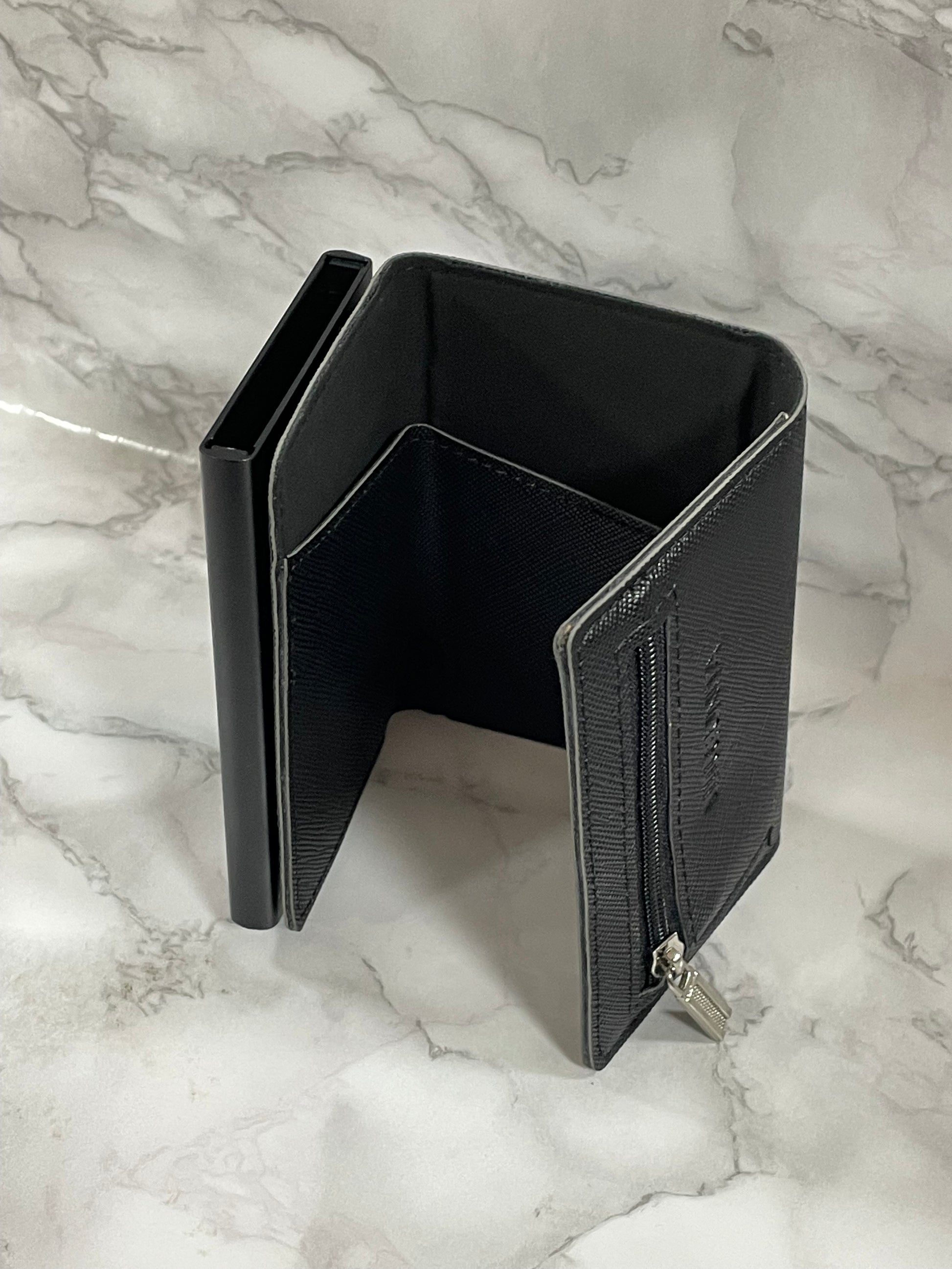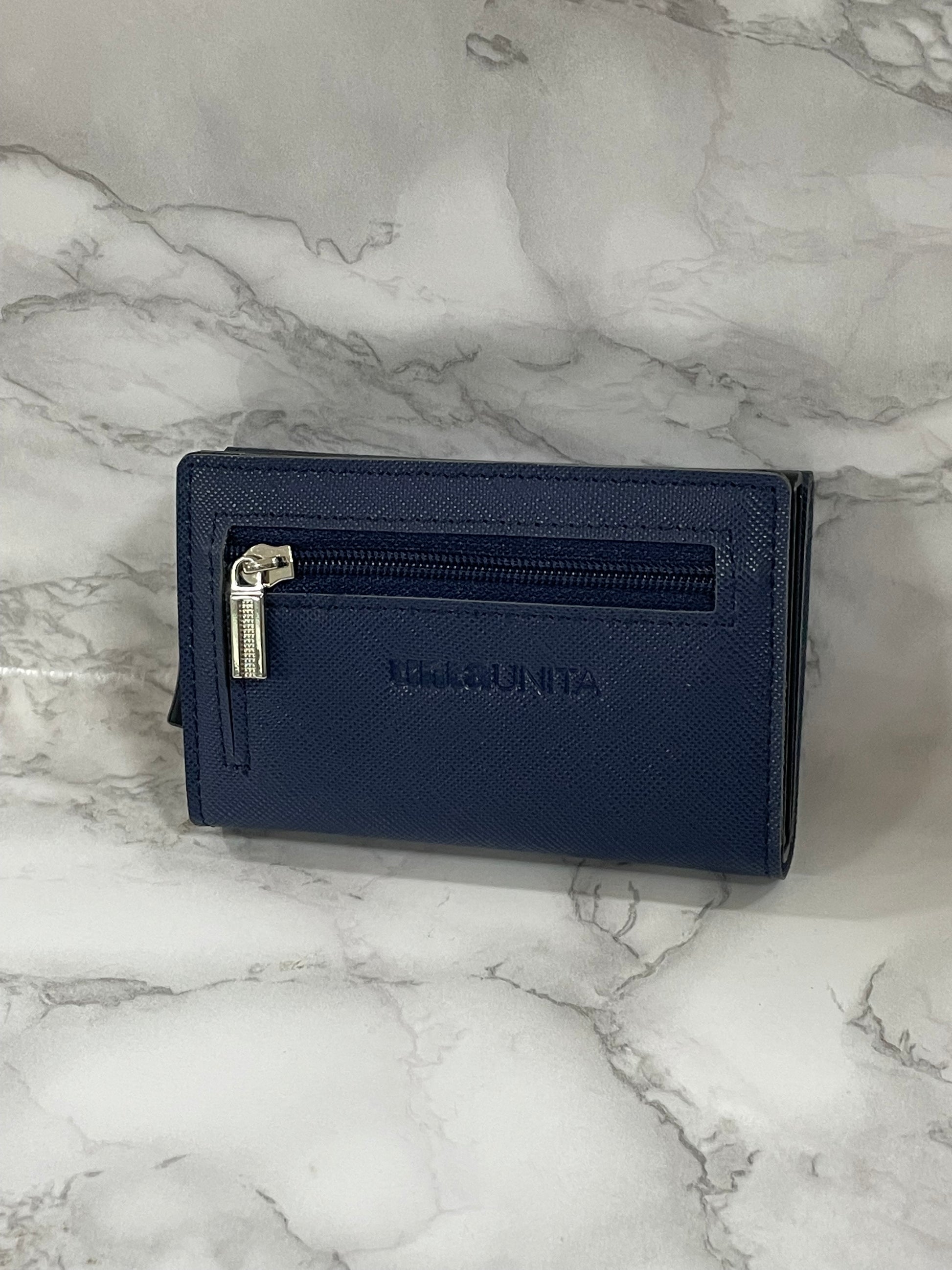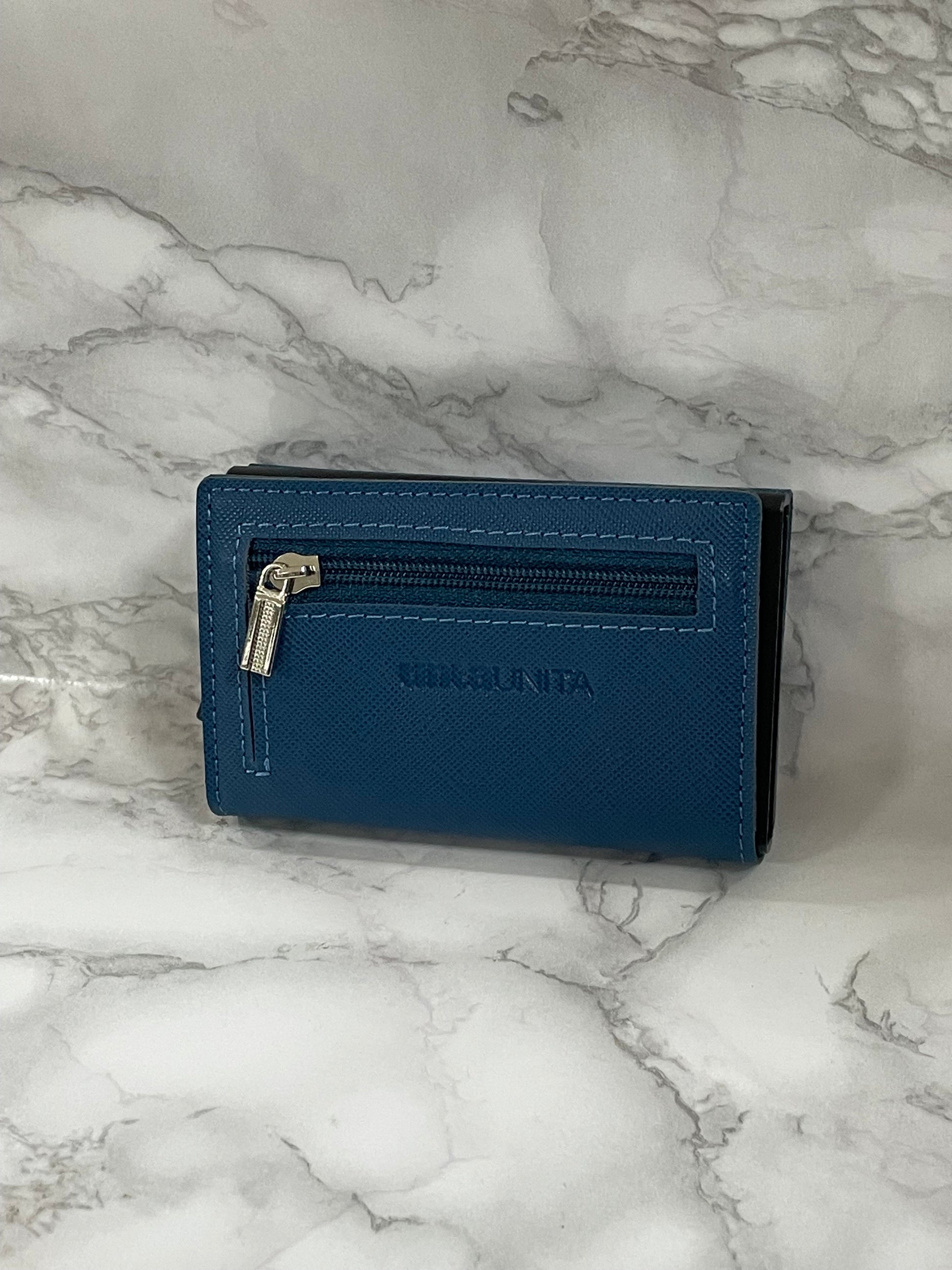 Con chiusura magnetica, cerniera portamonete sul retro, porta banconote sistema SLIDE, tasto per espulsione carte, porta card in alluminio con protezione RFID/NFC. Prodotto in PU Saffiano.