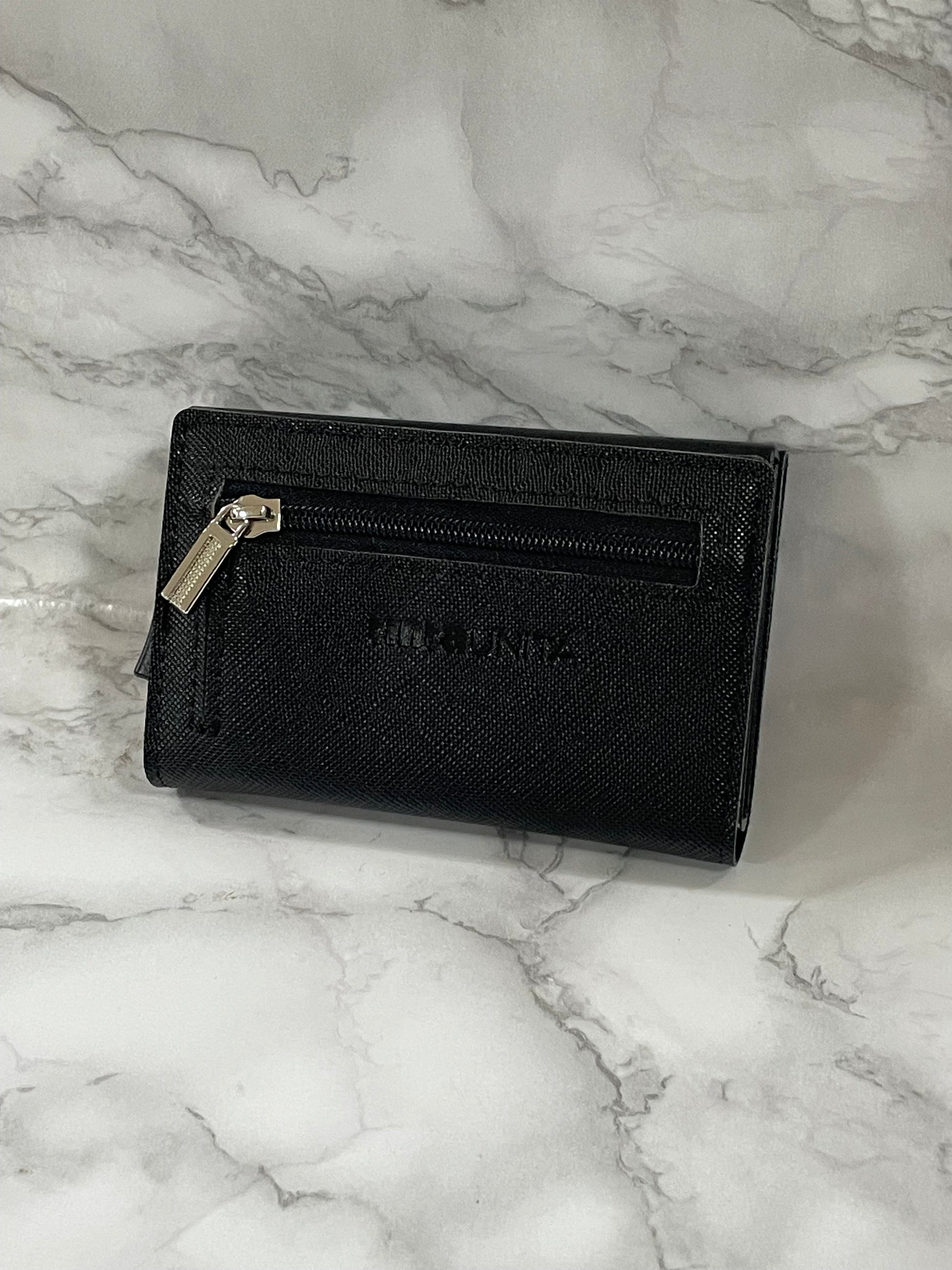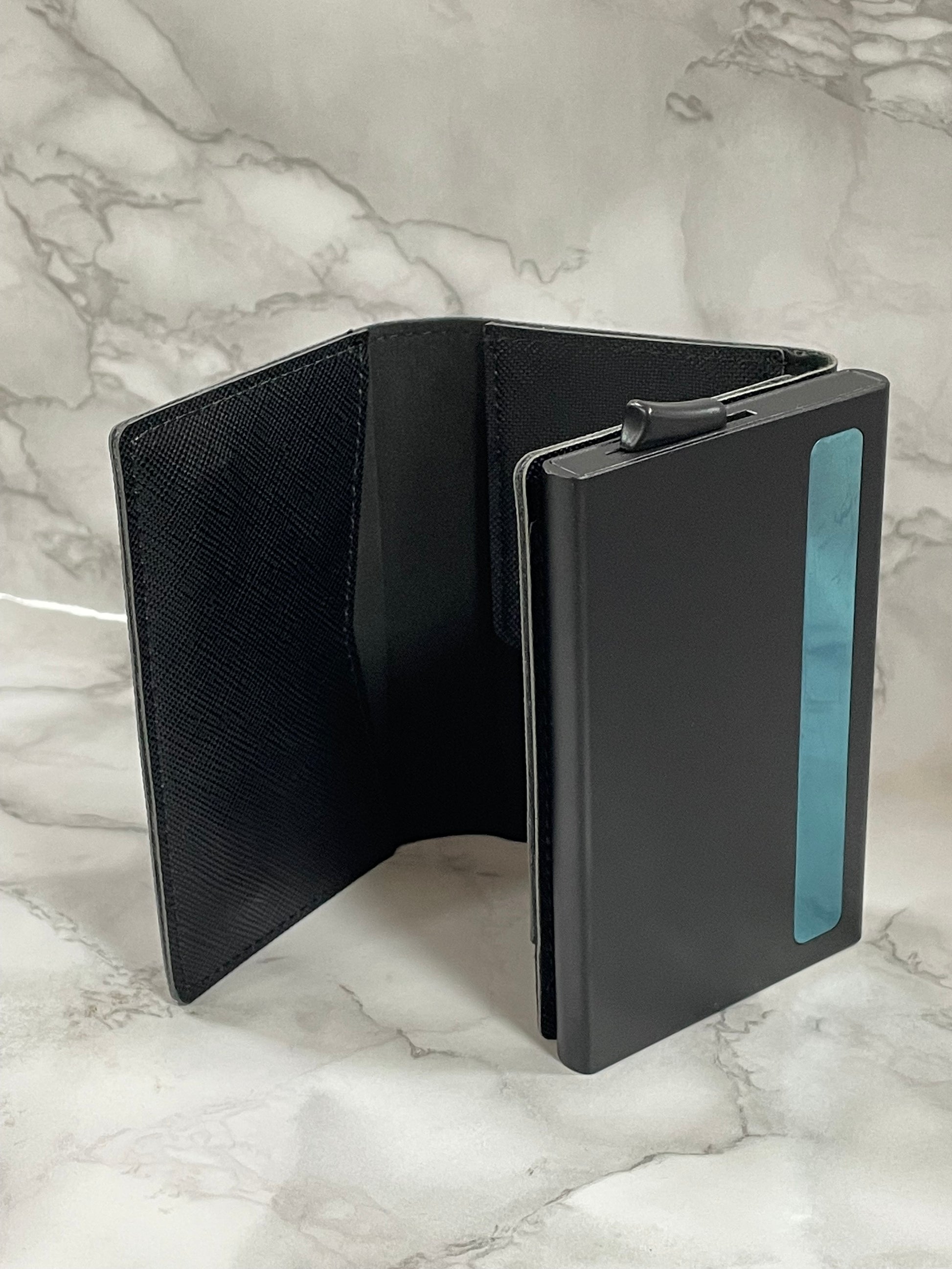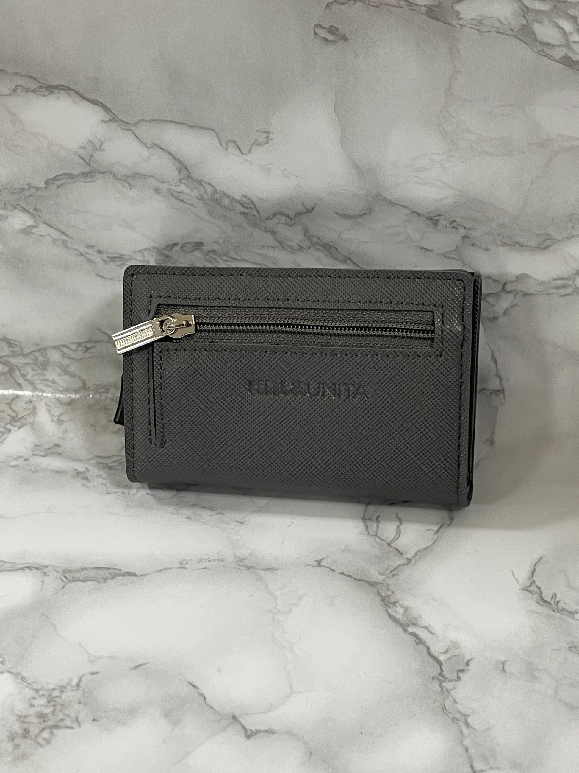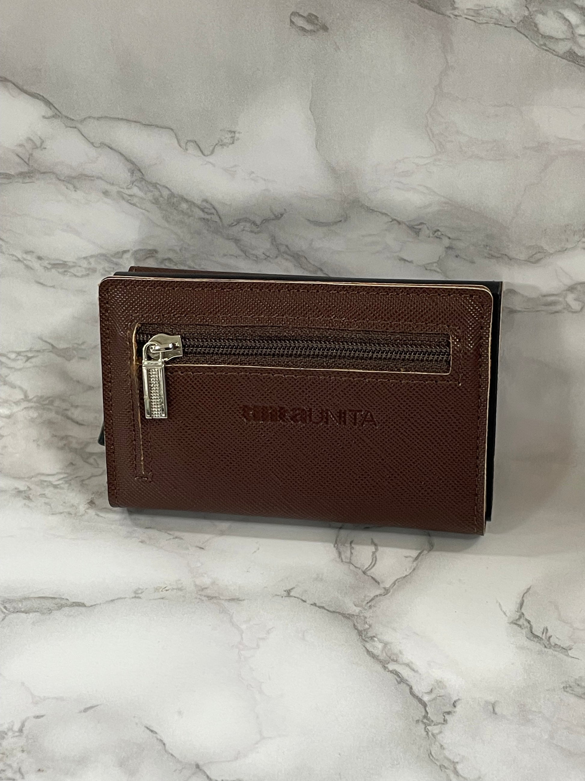 Con chiusura magnetica, cerniera portamonete sul retro, porta banconote sistema SLIDE, tasto per espulsione carte, porta card in alluminio con protezione RFID/NFC. Prodotto in PU Saffiano.