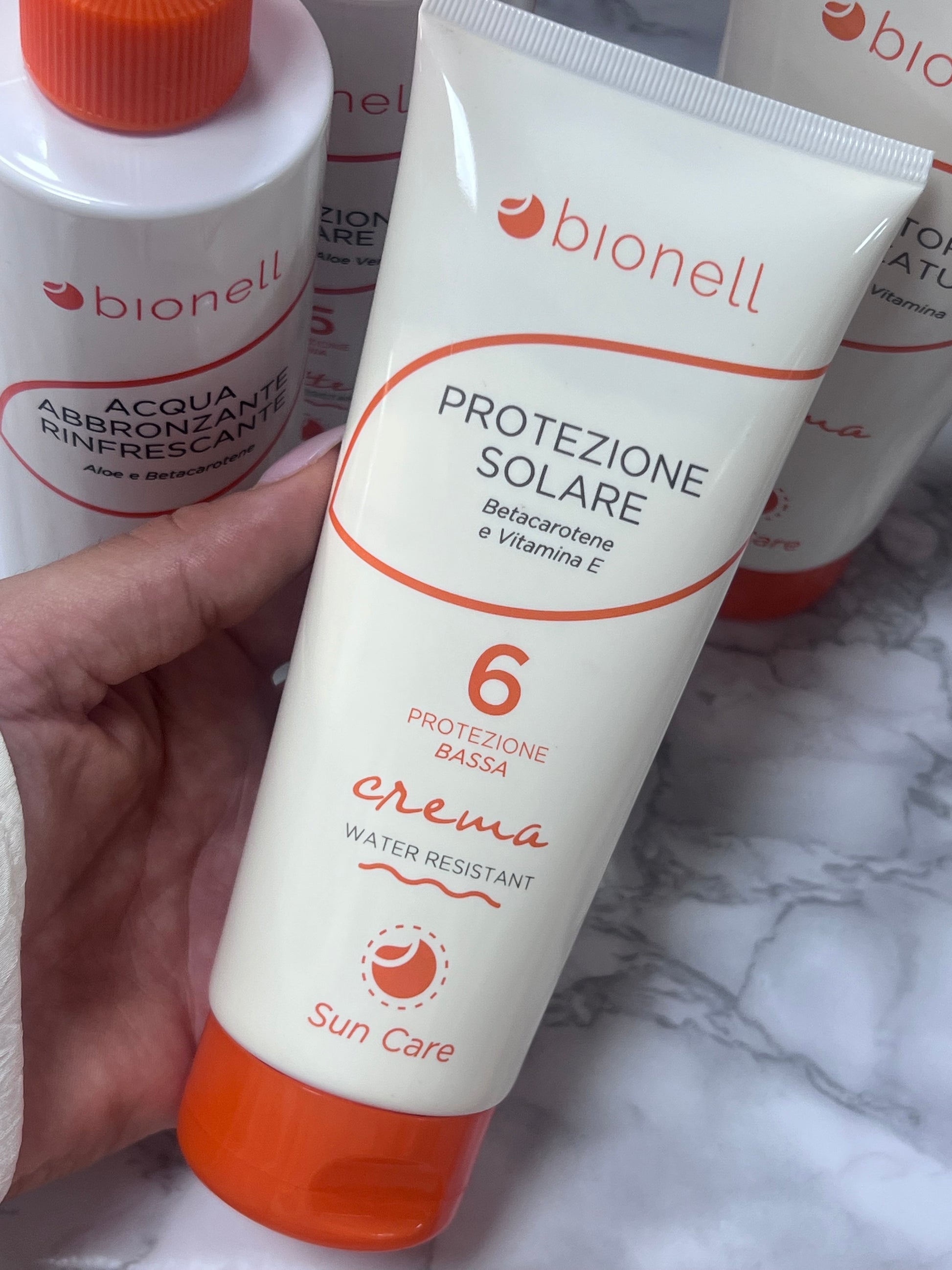 Crema solare a bassa protezione, con Betacarotene e Vitamina E. Resistente all’acqua. 200ml.