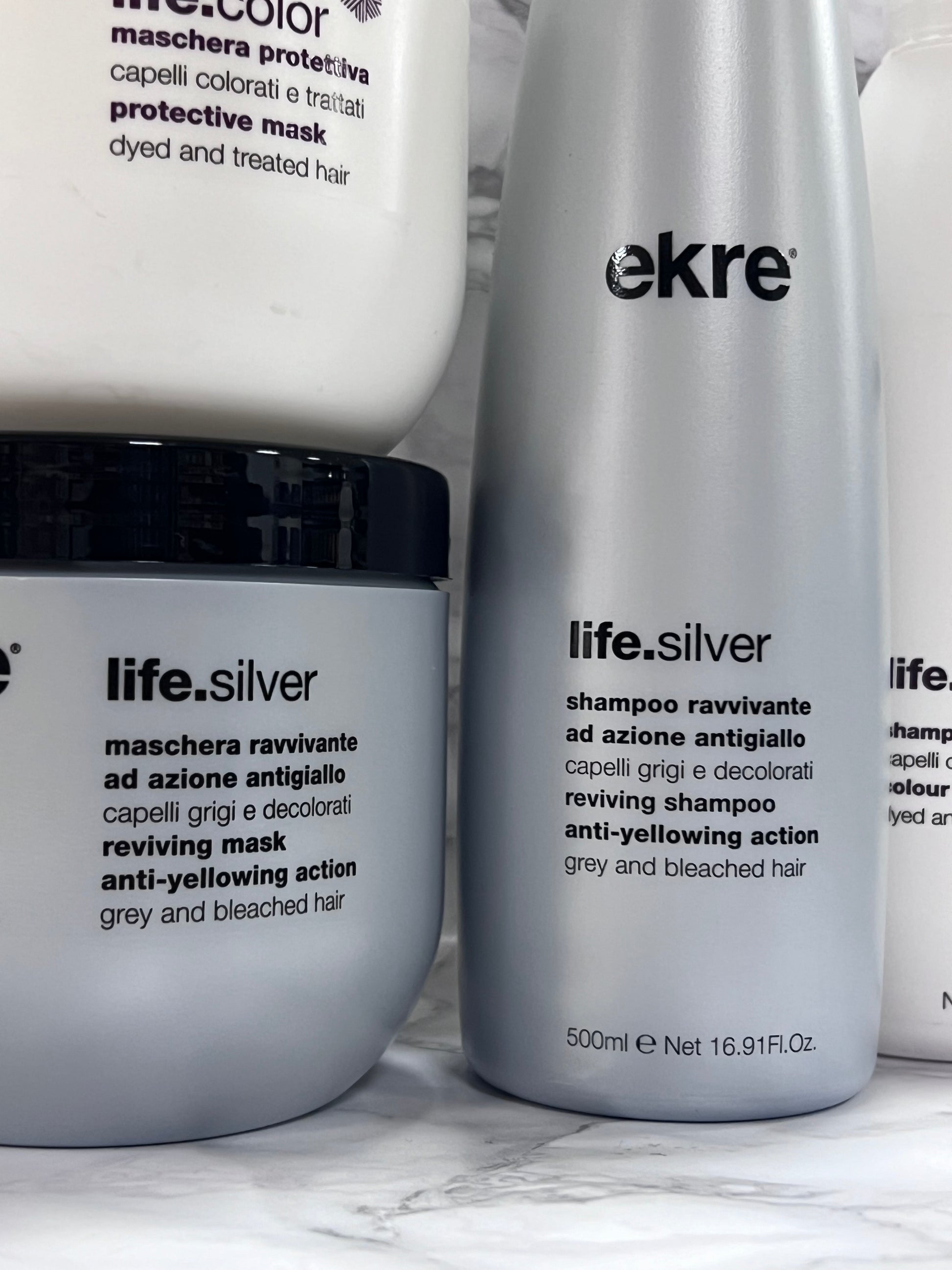 Life.Silver, shampoo ravvivante ad azione antigiallo, per capelli grigi e decolorati. 500ml.