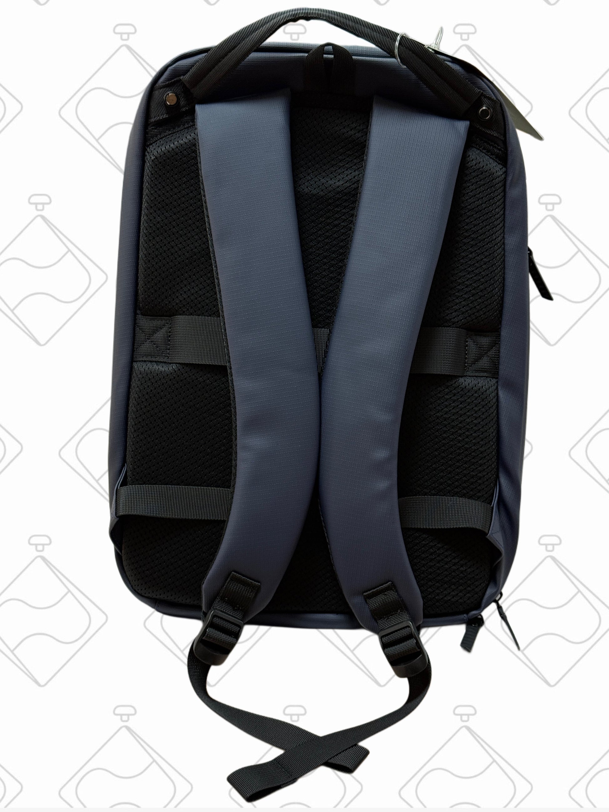 Zaino in tessuto idrorepellente. Scomparto imbottito con tasca per laptop, tablet e cavi. Ampio scomparto con organizer, tasca per alimentazione con porta USB e cavo, strap per trolley, tasche laterali e tasca per occhiali.