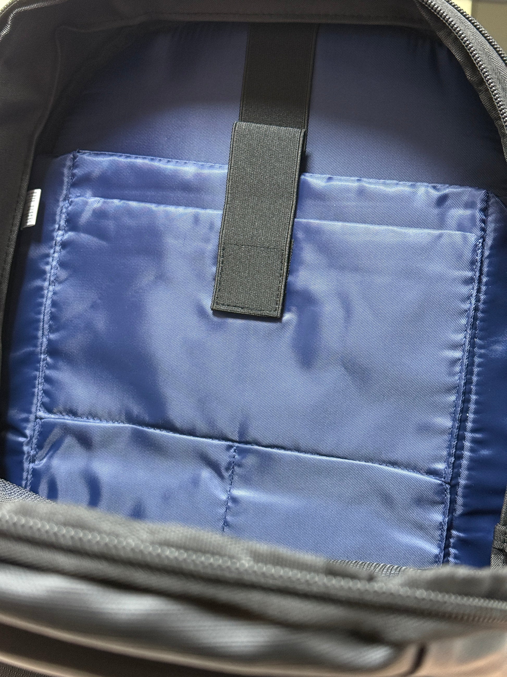 Zaino in tessuto idrorepellente, con maxi tasca frontale espandibile. Scomparto con tasca per laptop e tablet, strap per trolley e tasca nascosta per oggetti di valore sul retro.