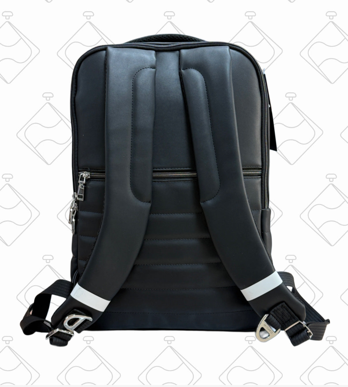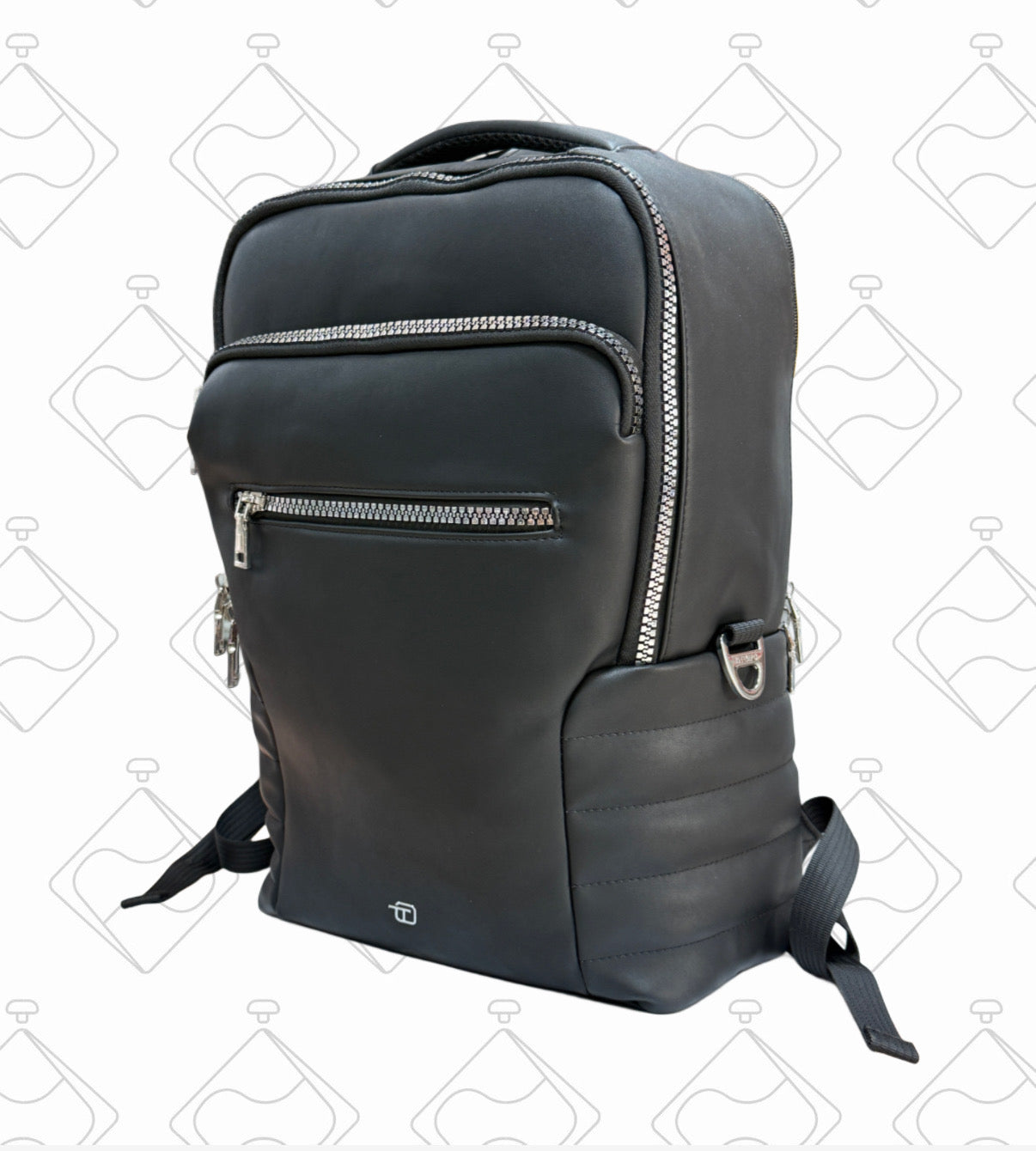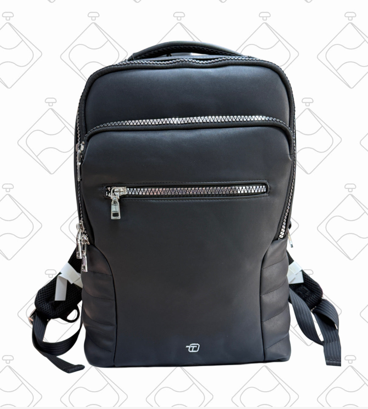 Zaino in morbida similpelle con metalleria cromata. E' dotato di due vani centrali, di cui uno con tasca porta PC e due tasche frontali. E' presente una tasca posteriore con una cinta per l'attacco al trolley.